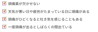 側頭部が脈打つようにズキンズキンと痛むことが多いです。片側が痛い場合もあれば、両側が痛いこともあります。一度痛みが出ると数時間続くことがあり、症状がひどい時は吐き気やめまいなどの症状があらわれる場合もあります。片頭痛が起こる頻度は人によって異なりますが、週に2回や月1回など不規則に症状があらわれている方が多くなってきます。原因として考えられることは、精神的なストレスや自律神経の乱れ、寝不足、月経に伴うもの、気圧の変化などです。